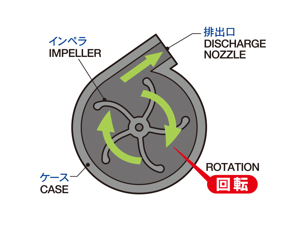 【 遠心ポンプの働き 】 水中モーターのパワーで、遠心ポンプ内部のインペラ(羽根車)を回すとケースの中で水の流れが発生。流れる水に遠心力が働いて、ケースの外側に圧力がかかり排出口から水がふき出します。同時にケースの中の水がふき出すので、それに引っぱられるような形で中心からは水が吸い込まれてポンプの役目をします。 【 基本スペック 】