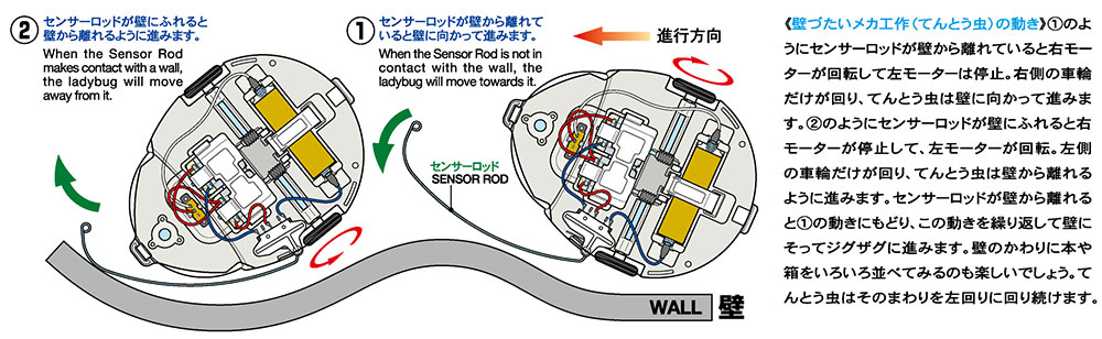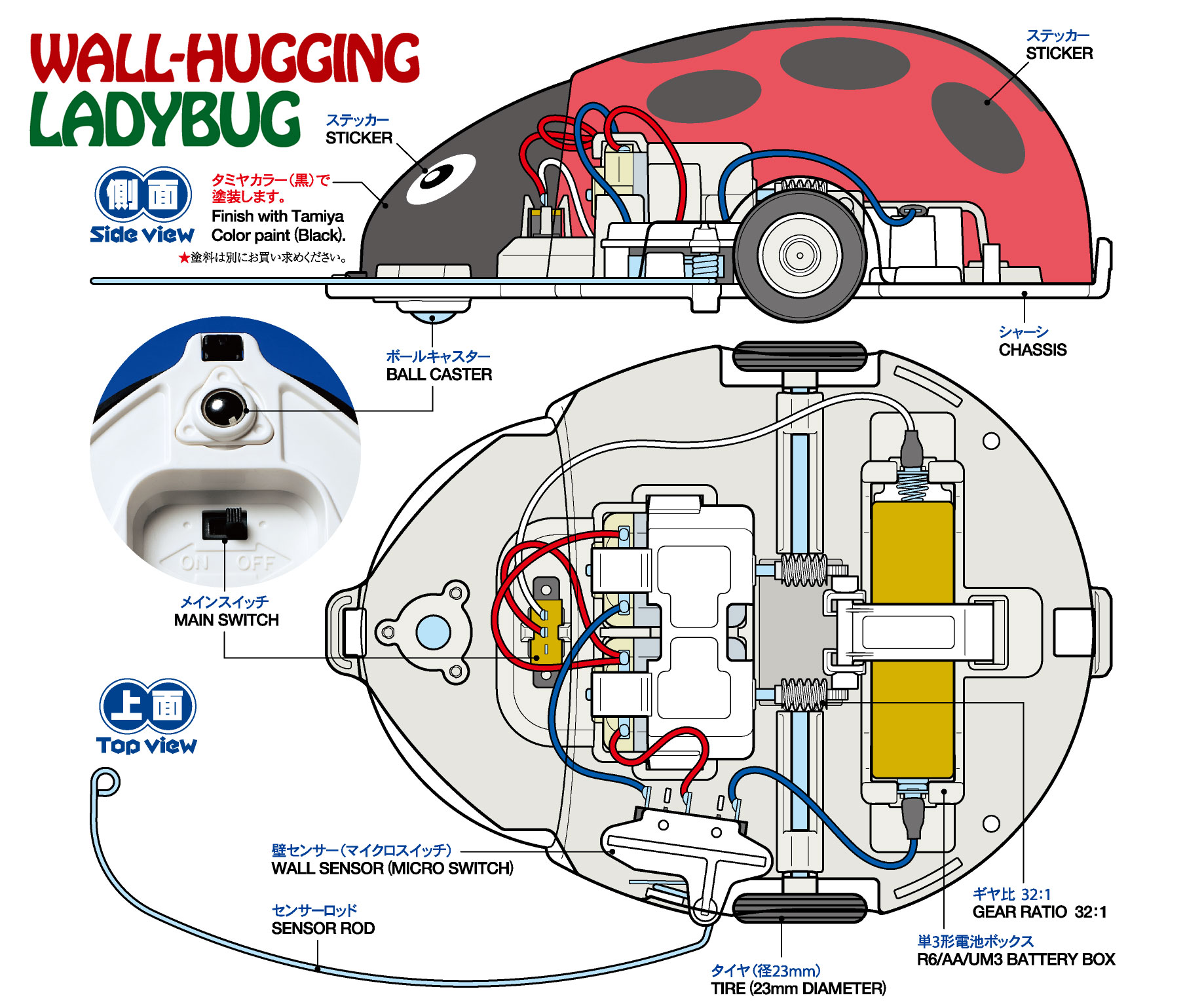 【 壁にそってジグザグに進みます 】 モーターと電池を使って壁づたいに進むてんとう虫の組み立て工作セットです。ボディは内部のメカが観察できるクリヤーレッドのABS樹脂製。目や背中の点模様はステッカーで用意。タミヤスプレーカラーで塗装も可能です。シャーシはホワイトのABS樹脂製。各パーツはビスを使わずに、はめ込み・押し込みだけで取り付けられます。センサーロッドとなるステンレス線は曲げ加工済み。メインスイッチをはじめ、マイクロスイッチ、モーター、電池ボックス金具はそれぞれハンダつけされ、配線する必要もありません。ゆっくりした動きを生み出すウォームギヤを使用し、車輪はグリップの良いゴム製。スムーズな方向転換を生み出すボールキャスターをフロントに装備しました。