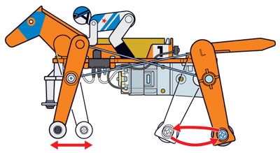 【 ジョッキーを乗せて軽快に走る競走馬のロボット 】左右の後足を同時に動かして軽快に走る、ジョッキーをのせた競走馬のロボットです。モーターの回転を後足に伝え、リンクロッドで前足に伝達。効率よくキックできるように後足の先にはグリップ部品、前足の先には抵抗にならないようにローラーをセットしました。