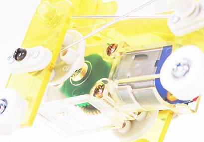 【 密林の王者、トラを作ろう 】 前後の足を動かして歩くトラ型ロボットの組み立てキットです。モーターの回転をクランクで前足に伝え、その動きをリンクロッドで往復運動に変えて後足に伝えます。クリヤーイエローの足やボディ、透明なギヤボックスなど必要なパーツをすべてセットしました。はめ込みとビス止めで組み立てられ、配線もゴムパイプを使って手軽に完成します。