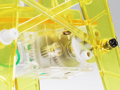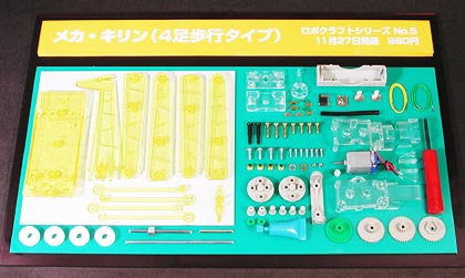 【 長い首と脚が自慢、動物園の人気者キリンの動きを再現 】 動物園の人気者、キリンをモデルにしたロボットです。モーターの回転運動をギヤボックスで減速し、クランクプレートとリンクロッドで往復運動に変換、4本の長い脚を優雅に動かして歩きます。胴体や脚、長い首、角の生えた頭などはクリヤーイエローパーツ。特に首と脚はモールドを施して模様を表現しました。
