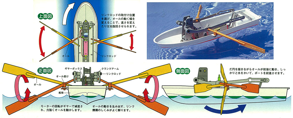 【 手こぎボートの動きそのままに、オールをこいで進みます 】 湖や海水浴場で見かける手こぎボートの組み立て工作キットです。モーターと電池を使ってオールの動きをメカニカルに再現。モーターの回転をクランクアームとリンクロッドで直線的な動きに変え、オールを前後に動かして進みます。またリンクロッドの取り付け位置が2ヶ所選べ、左右で取り付け位置を変えれば旋回させることもできます。船体は樹脂製の一体成形パーツで、浮力を高める発泡スチロール製フロート付き。ネジ止めやはめ込みで手軽に作れ、動きのメカニズムも興味たっぷりに観察できます。