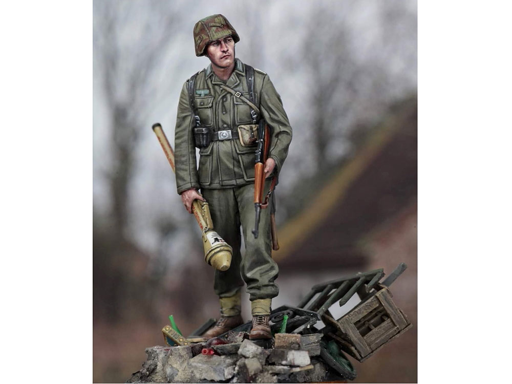 ・【丸平筆を使ったカルビン・タン氏の作例】 タミヤの丸平筆を使い動画内で塗装していたフィギュアの完成品を紹介します。写真の作品は「1/35 ドイツ歩兵セット(大戦後期)」のキットを使い、一部の部品を変更、必要最小限のディテールアップを施し、展示ベースを追加しています。