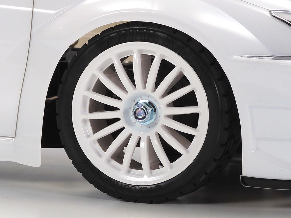 【 操縦性に優れセッティングも楽しいシャフトドライブ4WD、TT-02シャーシを採用 】 シャーシはシャフトドライブ4WDのTT-02。走行用バッテリーを左、モーターを右に縦置きにレイアウトした好バランス設計により操縦安定性に優れ、サスアームやアップライトを左右共通化して組み立てやすく、上下分割式のギヤケースなどにより整備性も高い構成となっています。さらに、パーツの組み換えなどによりホイールベース、車高、トレッドがそれぞれ2種類選べ、10種類の幅広いギヤ比が選択できるモーターマウントなどセッティングも楽しめます。また、ホイールハブはブレーキディスク風のデザインとし、実車のレーシングカートのバンパーをイメージしたフロントバンパーサポートを装備するなど、遊び心もたっぷり。フィンデザインのホイールにレーシングラジアルタイヤを装着しました。