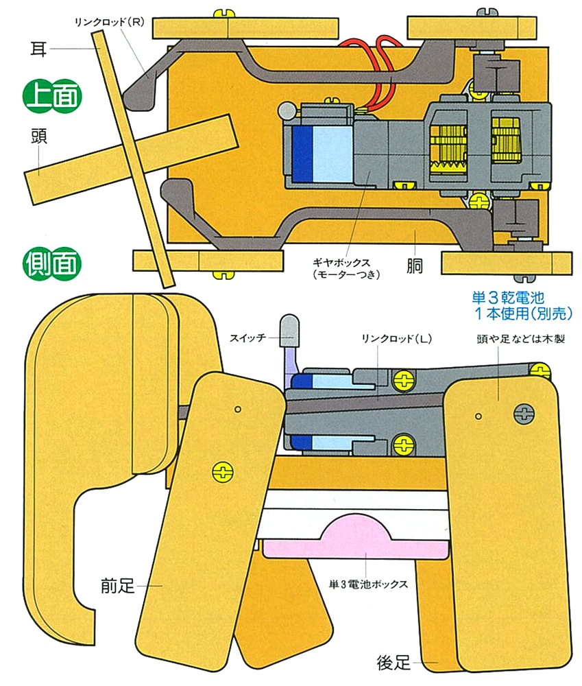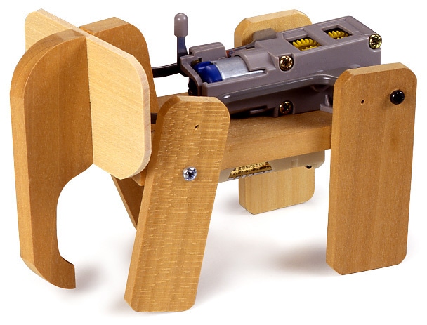 【 頭を左右にふりながらゆっくりと歩く象の工作セットです 】 クランクとリンクロッドの働きで、頭をふりながらゆっくり歩く象をイメージした組み立て工作キットです。木製の足や頭、耳などはカット加工ずみ、しかもビスの下穴が開けられ、タッピングビスで手軽に組み立てられます。ビス止めで確実に組み上がるギヤボックスは、ギヤやケースに動きがなめらかで信頼性の高い特殊強化プラスチックを使用。リンクロッドも動きのスムーズなプラスチック製としました。後足の動きに合わせて前足を動かし、前に伸びたロッドが耳の後ろを押して頭を左右に振る動きを生み出します。