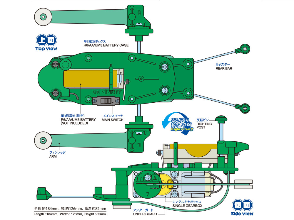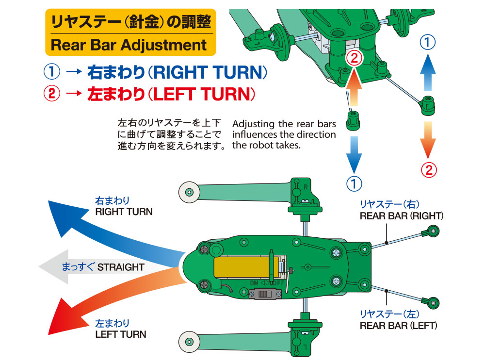 【 進む方向も変えられるよ! 】 左右のリヤステーを上下に曲げて調整することで進む方向が変えられます。リヤステーの右を上げて左を下げれば右回り、リヤステーの左を上げて右を下げれば左に回ります。さらに、 ギヤボックスの取り付け位置を変えることで、地面でクロールしているような動き をさせることもできます。