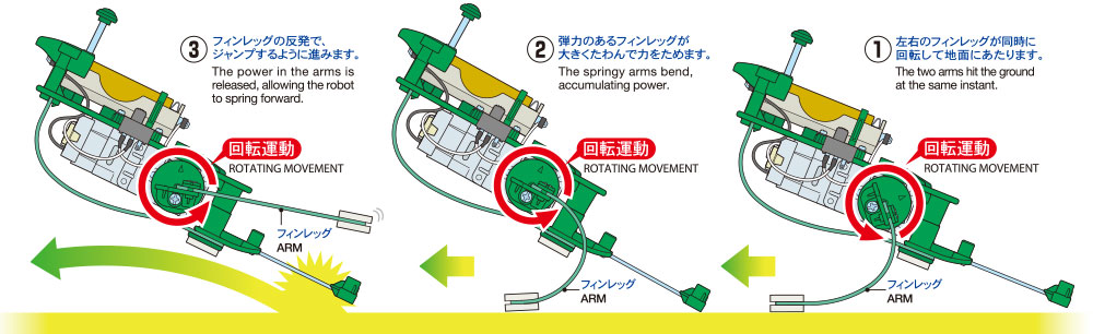 【 両足でキックしながらはねるように進みます! 】 たわむ材質を使用したプレート状の足(フィンレッグ)を同時に回転させることで、ジャンプするように進むユーモラスな動きの工作セットです。平らなところはもちろん、凸凹のある面やちょっとした段差も乗り越え、前部にツノのような反転ピンが付いているので、ひっくり返っても自力で起きあがります。足と同じ弾力のある素材を使用したアンダーガードでジャンプの時のショックを吸収して動きを助けるだけでなく、ギヤボックスを守ります。また、安定したジャンプの動きを生み出すリヤステーを装備。ステーを調整して進む方向を変えられます。足を回転させるシンプルな構造なので、組み立ては手軽。必要な部品もすべてセットされていて、ネジ止めとはめ込み、簡単な配線だけで完成します。