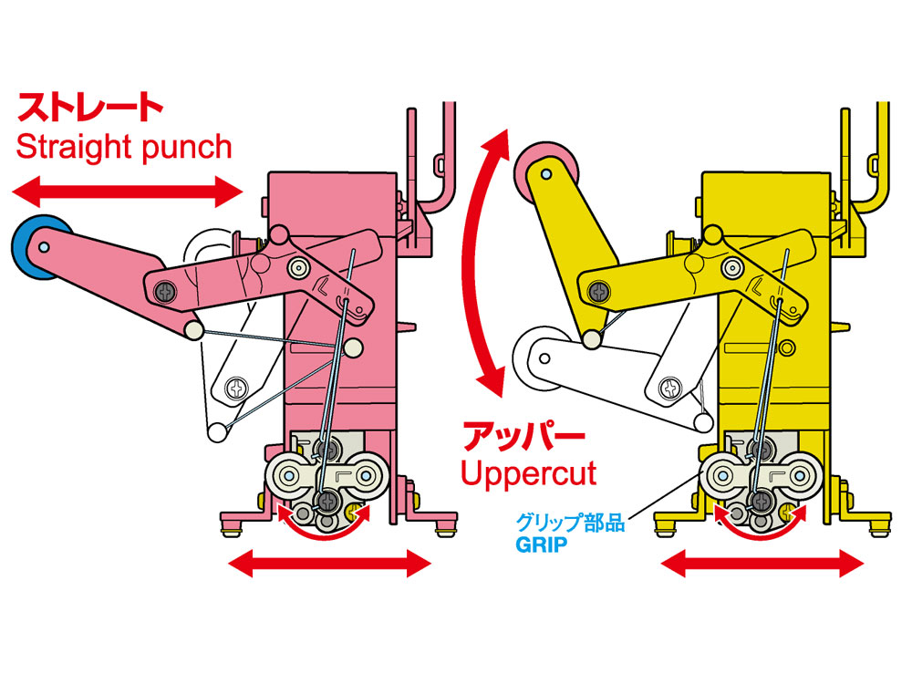 【 遊び方 】 強烈なパンチで相手をノックアウトさせるのはもちろん、顔の口の部分にある攻撃ポイントに有効なパンチをあびせて、相手ロボットの背中にあるジャッジプレートが下がれば勝ちです。