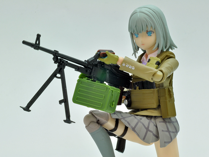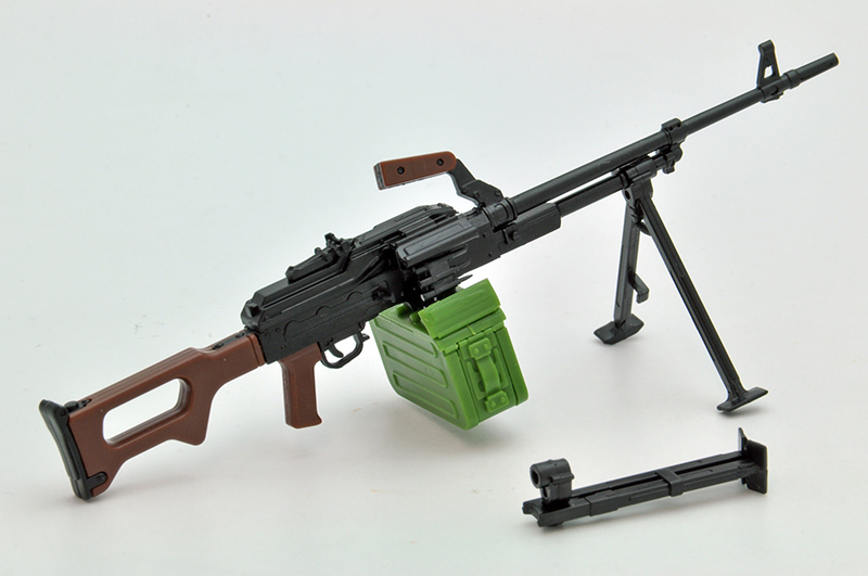 旧ソ連で開発された東側を代表する汎用マシンガン、PK(プリミョート・カラシニコバ=カラシニコフ式機関銃)と、改良型のPKM。 主力小銃AKよりも強力なモシン・ナガン、ドラグノフ用7.62mm×54R弾を非分離式リンクベルトによる給弾で使用します。 カラシニコフ設計による信頼性と整備性の高さ、同クラスの西側汎用機関銃比べると非常に軽量(M240が12.5kgに対してPKMは8.4kg)である点などが高く評価されています。 当キットでは、開閉選択式の2脚。100連弾薬箱と、特徴的な右からの給弾を再現したスタータータブ付ベルトリンクが付属。銃床と弾薬箱は別色。