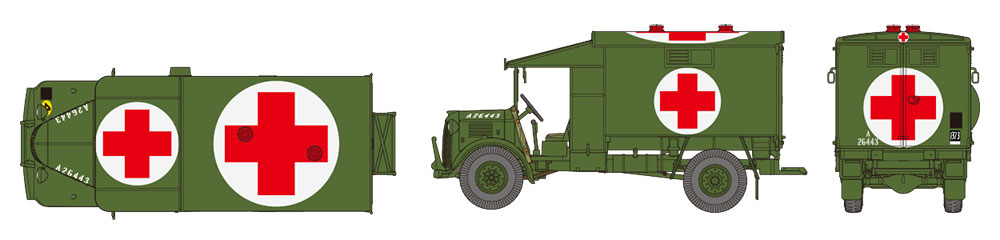 【 数々の戦場を駆けた救護活動のスペシャリスト 】 1940年から第二次大戦終結までにイギリス軍が13,000輌余りを生産し、救護活動に力を発揮したのが2トン 4×2 野戦救急車です。車体は民間用の小型トラックをベースとして、陸軍医療隊が後部コンパートメントを独自に開発。2段ベッドに変形可能なベンチシートなど、医療用の設備を数多く取り入れていました。任務に従事した戦域はフランスや北アフリカ、イタリア、ノルマンディ以降のヨーロッパと幅広く、陸軍での運用はもちろん、各地の空軍基地などでもその姿が見られました。