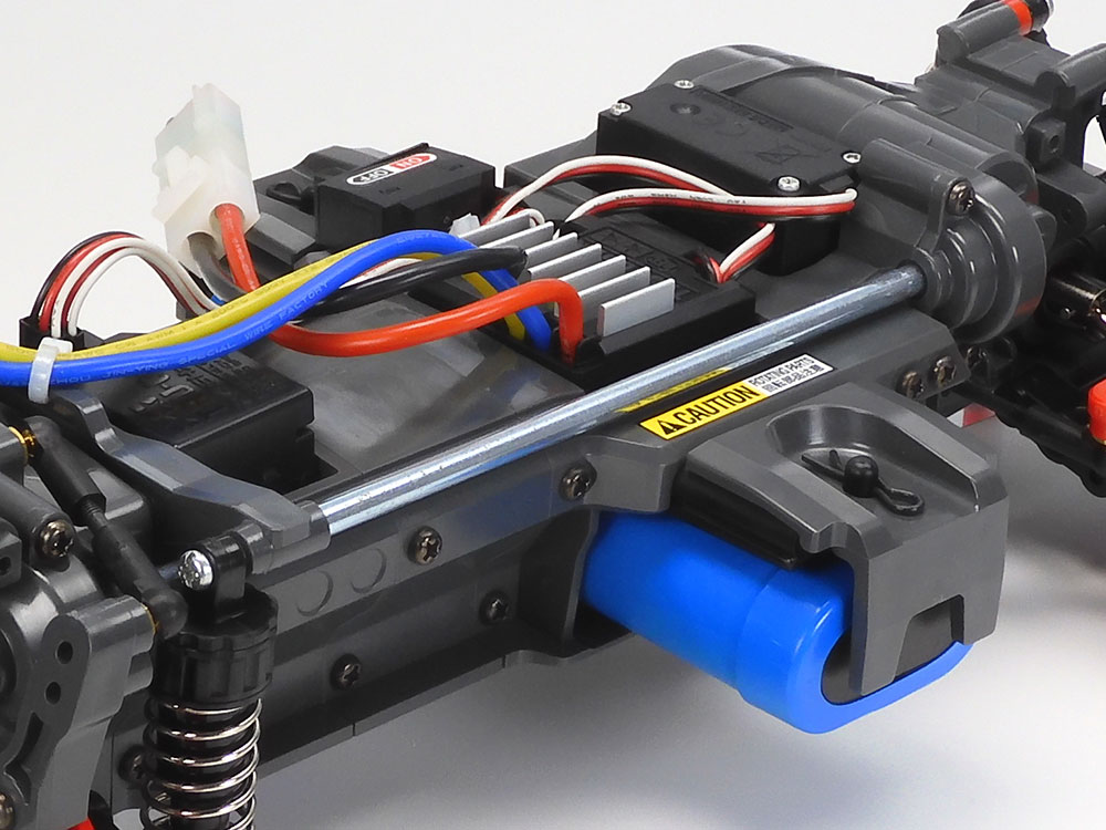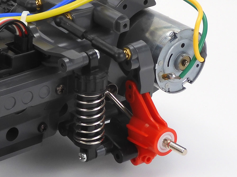 【 走行シーンを広げるコンパクトサイズのシャフト4WD、MF-01Xシャーシ 】 シャーシはオンロードからダートまで路面を選ばず走りが楽しめるコンパクトサイズの4WD、MF-01Xを採用。強度の高い左右分割式のモノコックフレームは、ギヤボックスまで一体化して組み立てやすさも追求しました。リヤエンドにモーターを搭載し、ギヤで後輪に、プロペラシャフトで前輪にパワーを伝達。前後の密閉式ギヤケース内にはデフギヤを装備してスムーズなコーナリングを実現します。さらに、車体のほぼ中央に走行用バッテリーをセットして重量バランスも良好。サスペンションはフリクションダンパーを装着したダブルウィッシュボーン4輪独立。アップライト・ハブキャリアはオフロード走行に対応したM-05Raシャーシ用を採用。クラシカルなデザインのディッシュホイールには、ラリーブロックタイヤを装着しました。