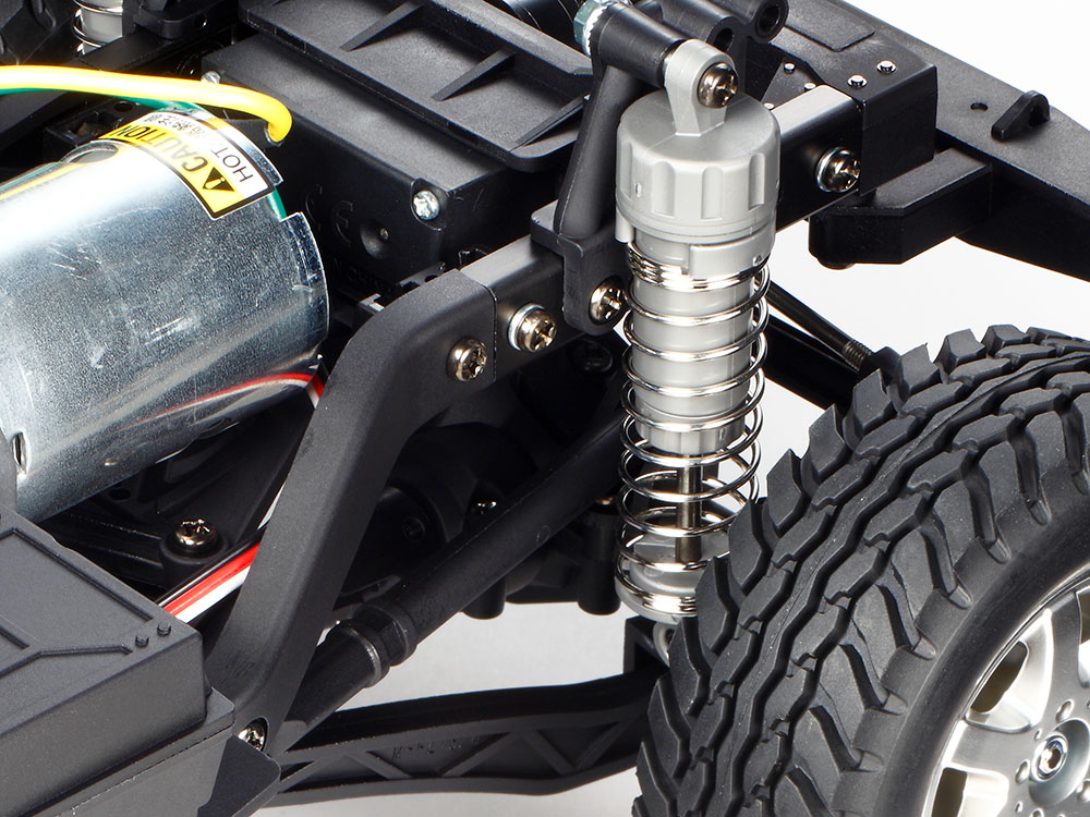 【 走破性の高い4リンクサスを装備したシャフト4WDのCC-02シャーシ 】 実車ライクなラダーフレーム形状を採用したCC-02シャーシは高い剛性と実感を両立。フロントアクスル後部にモーターを縦置きし、ギヤボックスとトランスファーケースをセパレートタイプとし、プロペラシャフトで前後に駆動力を伝達。幅広いギヤ比が選択でき、スムーズなパワー伝達に加えて、形状も実車感を追求しました。サスペンションは強度の高い樹脂製アクスルハウジングをCVAオイルダンパーと4本のリンクで位置決めする、前後4リンクリジッド。シンプルな構成で強度が高く、最低地上高が変化しにくいオフロード走行に適したサスペンション。繊細なコントロールが要求されるロックセクションも楽しめます。また、つや消しメッキ仕上げの7本スポークホイールには、オフロードでも十分なグリップを発揮するブロックパターンタイヤを装着しました。