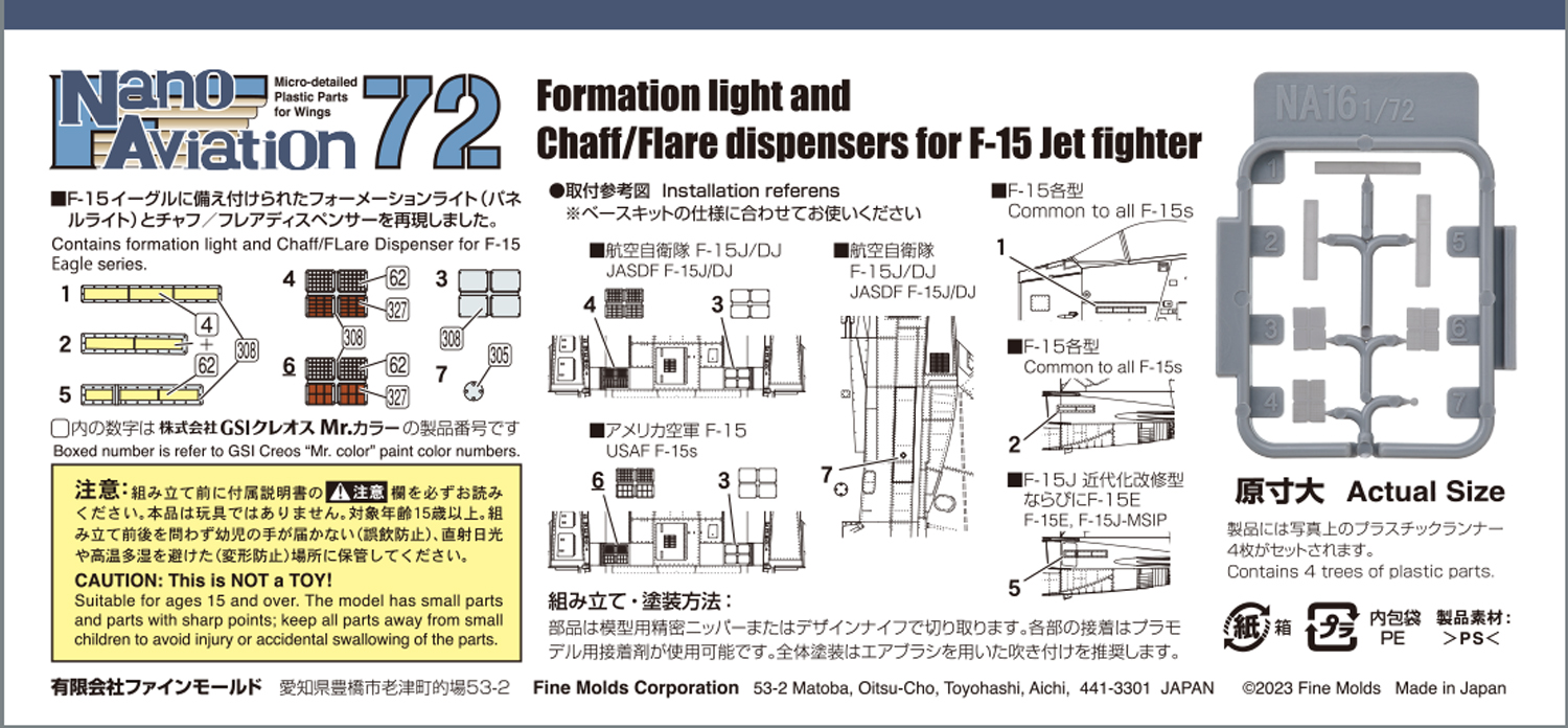 F-15戦闘機各タイプに対応した機体側面に装備された長方形のフォーメーションライトと、チャフ/フレアディスペンサーを精密プラパーツで再現。