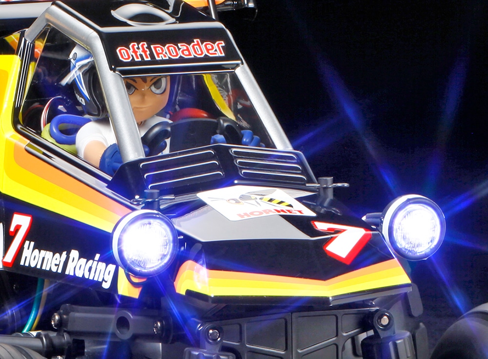 【 アクションたっぷりの走りが面白すぎる! 】 1984年にデビューして2WDオフロードカーのブームを生み出したホーネット。このホーネットをかわいらしくデフォルメした電動ラジオコントロールカーの組み立てキットです。前後にギュッと縮めてコクピットを強調したゆかいなフォルムのボディとリヤウイングは軽くて丈夫なポリカーボネート製。マーキング用ステッカーや、窓の塗り分けに便利なマスクシールもついて、ブラックで塗装してステッカーを貼るだけでボディが手軽に仕上がります。 また、前後のライトケースには別売の直径5mmのLEDが組み込め、実車感を演出しています。さらに、走りを楽しくする、Tシャツ姿のドライバー人形も注目。5種類の目の表情のステッカーに加えて、ヘルメットはバイザーやチンガードが別部品なので、様々な仕様に仕上げられます。シャーシは舗装された道から、凸凹のあるオフロードまでどこでも遊べる後輪駆動のWR-02CB。豊富にそろったWR-02用のオプションパーツで性能アップやセッティングも楽しめる、面白さ満載の遊び仲間です。