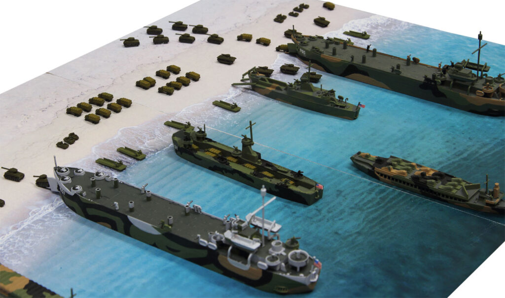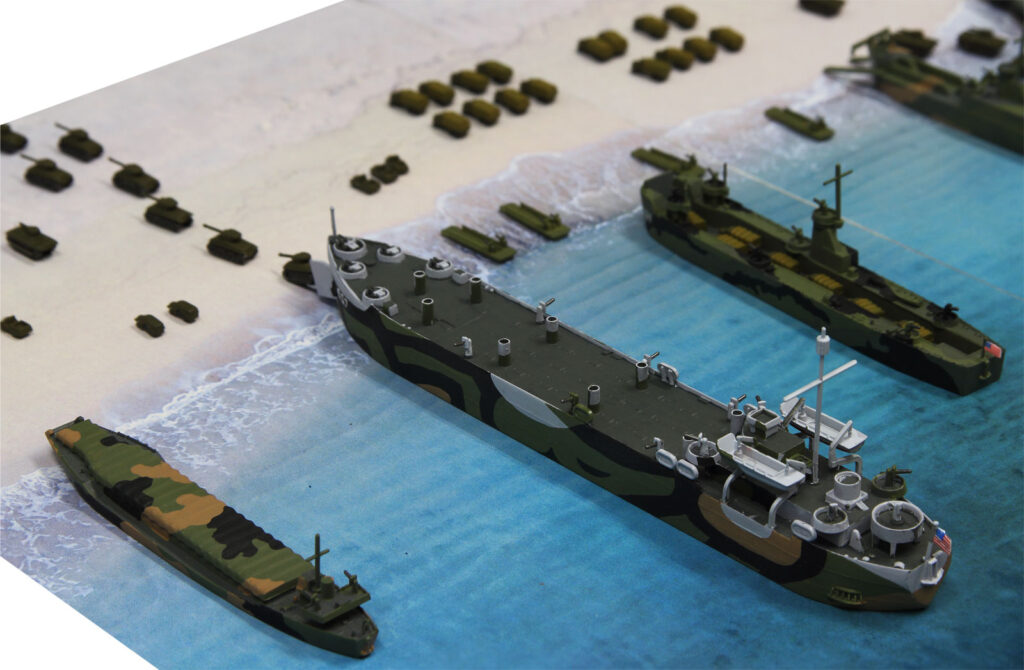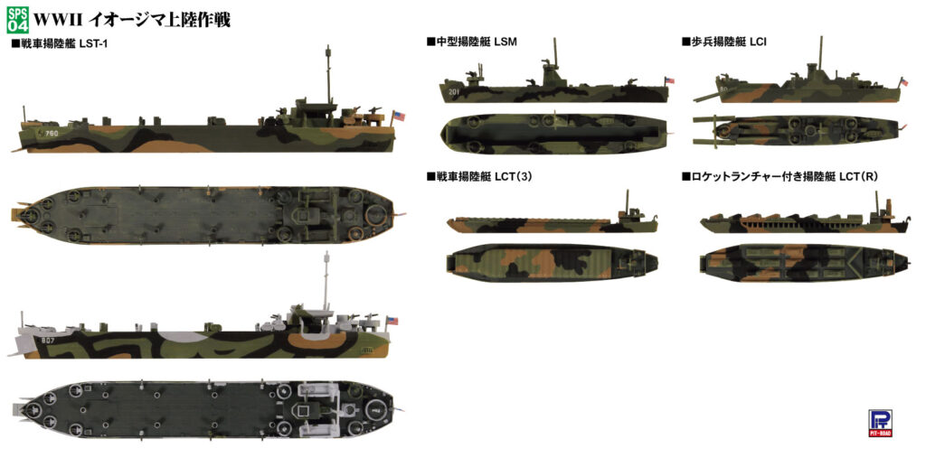 1945年2月19日に開始された、アメリカ軍によるイオージマ上陸作戦における、LST、LSM等の揚陸艦などによるビーチングの情景を再現できるプラモデルとペーパーベースのセットです