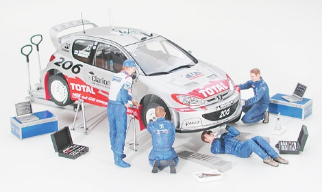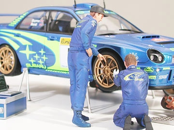 【 作ろう情景、カーモデルの楽しみが広がる 】 公道最速を競う世界ラリー選手権。舗装路はもちろん、オフロードやスノーロードを驚異的なスピードで駆け抜けるラリーカーの走りを支えているのがメカニック達。SSと呼ばれるタイムアタック区間を1日に5~9個所こなし、3日間に渡る激戦を走り抜くだけに、マシン整備も勝敗を分ける大きなポイントです。SS終了後、無線によりドライバーがトラブル個所やセッティング変更を指示。マシン整備が許されるサービスパークに入るやいなや迅速に作業が行われ、時にはわずか20分でトランスミッションをも交換するという早業を披露。ドライバー同様、メカニック達も厳しいラリーを戦っているのです。