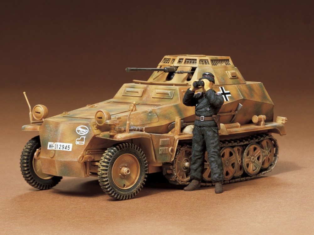 ドイツ軍の傑作ハーフトラックSd.Kfz.250のバリエーション、Sd.Kfz.250/9軽装甲偵察車デマーグのプラスチックモデル組み立てキットです。オープントップの砲塔に20mm機関砲を搭載する小型ながら精悍なスタイルをあますところなく再現。連結組立式のキャタピラなど複雑な足まわりも立体感あふれる仕上がりです。双眼鏡を覗く乗員の人形1体付き。