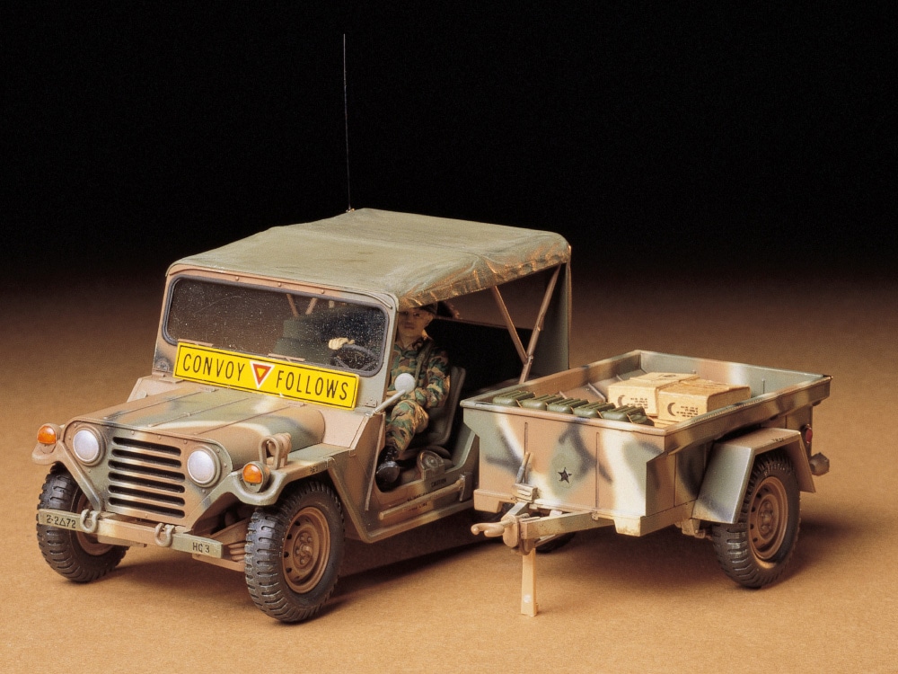 小型4輪駆動車ウィリスMBジープの後継車として戦後に開発されたM151と、後部に連結されるカーゴトレーラーのプラスチックモデル組み立てキットです。M151は高い機動力を感じさせる小柄な車体をリアルに再現。カーゴトレーラーに搭載するジェリカンや厚紙を切り抜いて作るCレーション用カートンなど豊富な装備品を用意。ドライバーの人形1体付き。