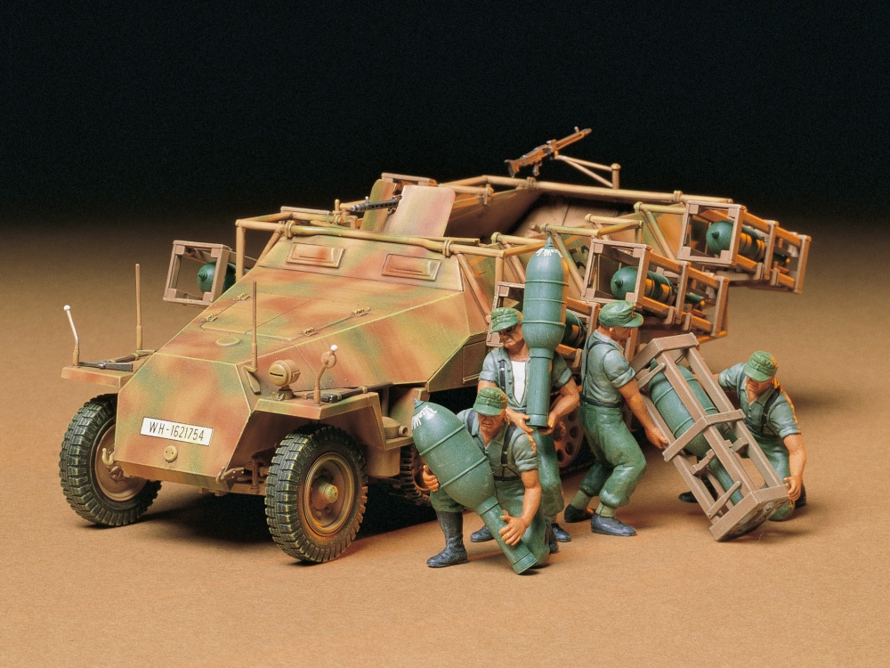 スツーカと言えば第二次大戦前半に猛威を振るったドイツの急降下爆撃機。その攻撃力にも匹敵するパワーを備えた戦闘車輛として、ドイツ軍将兵の信頼を集めた「地上のスツーカ」、ハノマークD型ロケットランチャー搭載型のプラスチックモデル組み立てキットです。6発のロケット弾を車体左右の四角い発射フレームに収めたスタイルからは、発射時の凄まじい噴煙も目に浮かぶでしょう。複雑な転輪配置の足まわりやオープントップの車内も精密に再現。ロケット弾を準備する動きにあふれたシャツ姿の兵士の人形4体入り。