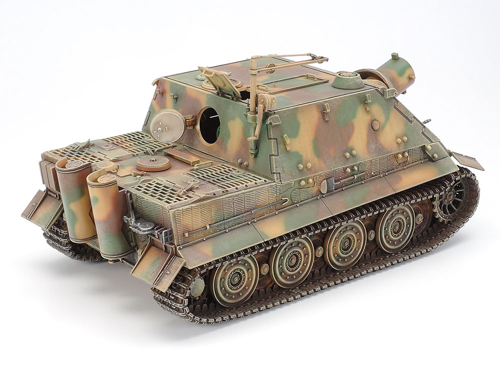 【 モデルからも伝わる、38cmロケット砲の威力 】 ドイツのタイガーI型戦車の車体に38cmロケット砲を搭載し、要塞攻撃用戦車として第二次大戦の末期に登場したのがストームタイガーです。そのスタイルの大きな特徴となっている太く短いロケット砲は、自らのロケット推進によって飛行する砲弾を発射するもので、本来はドイツ海軍が潜水艦攻撃用に開発したものでした。そして重量30kg、全長149cmという巨大な砲弾は炸薬重量135 kg、最大射程距離4600mという強力な威力を持っていたのです。ストームタイガーの生産は1944年の8月からタイガーⅠの車体を改造する形で行われ、同年の12月までに18輛を生産。完成したばかりの最初の数輛は8月からワルシャワで始まった自由ポーランド軍の蜂起の鎮圧に投入されました。そしてその後もドイツ本土防衛戦に出動して終戦まで戦ったのです。