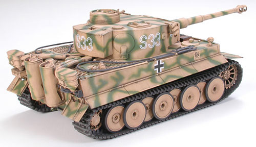 【 タイガーI初期生産型について 】 第二次大戦中盤の1942年末、ソ連のT34やKV-I戦車に苦戦を強いられていた東部戦線、そして米英軍の攻勢の前に後退を余儀なくされていた北アフリカ戦線のドイツ軍部隊に、それまでのIII号、IV号戦車とは一線を画す、強力な主砲そして分厚い装甲を備えた戦車が出現しました。これこそ新型重戦車タイガーIだったのです。ヘンシェル社が、後世に名を残すこのタイガーIの開発を命ぜられたのは1941年5月末のことでした。しかもすでに開発を進めていたフェルディナント・ポルシェ博士との競作だったのです。ヘンシェル社の設計案は最大装甲100mm、側面80mmの角形車体を片側8本のトーションバーと24個の転輪で支える手堅いものでした。主砲と砲塔は、クルップ社がポルシェ案車体用として新たに設計した56口径88mm戦車砲36型と前面装甲100mm、側面80mmの馬蹄型の砲塔をほぼそのまま搭載、エンジンは12気筒、出力650馬力のマイバッハHL210P45を装備していました。この開発案は独ソ戦の開始で強力なソ連製戦車と遭遇したことにより、早くも1942年の春に量産命令が出されたのです。1942年8月から正式に量産が開始され、主に第501重戦車大隊を始めとする新編成の独立重戦車大隊に配備、陸軍司令部の直轄として運用されました。その後11月生産分から車体後部にエアクリーナーを追加、12月からは砲塔防盾の一部が補強されるなど車体各部を改良。タイガーI初期生産型は1942年11月から1943年6月までに約200輌が生産され、東部戦線や北アフリカ戦線、さらにイタリア戦線にも投入されました。出現当時は連合軍側に対抗する戦車がないほど強力な、まさに無敵の重戦車で、数々の改良を重ねて大戦終結まで戦い続けたタイガーIは、圧倒的な攻撃力の88mm砲と至近距離からの砲撃をも跳ね返す重装甲で連合軍将兵の大きな脅威となったのです。