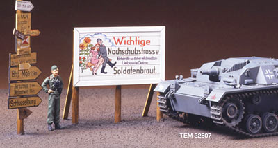 【 道標について 】 道路標識は部隊や兵士に対して適切な指示を与えるという非常に重要な役目を果たしています。大戦中にドイツ軍で使われた標識は、目的地の地名や距離を表示する標識以外にも様々なものがありました。例えば地雷原など危険地帯に立てられて兵士の注意を促す標識、補給所や野戦病院などの所在地や方向を示す標識、そして部隊の移動や集結のための情報を提供する標識などです。これらの設置には電柱や建物などもよく利用され、1か所に大小様々な標識が密集して取り付けられる場合もありました。