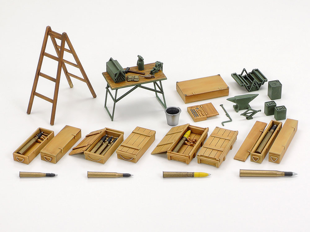 ●工具類や各種砲弾など臨場感を高めるアクセサリーを豊富にセット。(付属アクセサリー:キングタイガー用徹甲弾、タイガーI 用榴弾、パンサー用徹甲弾、IV号戦車用徹甲弾、各砲弾用木箱、開閉状態のツールボックス、ハンマー、万力、金とこ、オイル差し、バーナー、ツールキット、工具袋、ジャッキ、クランク、作業机、脚立、オイル缶、一斗缶、木箱、バケツ) ●1/48MMシリーズに揃った戦車や車輌と組み合わせ、幅広い情景設定が楽しめます。