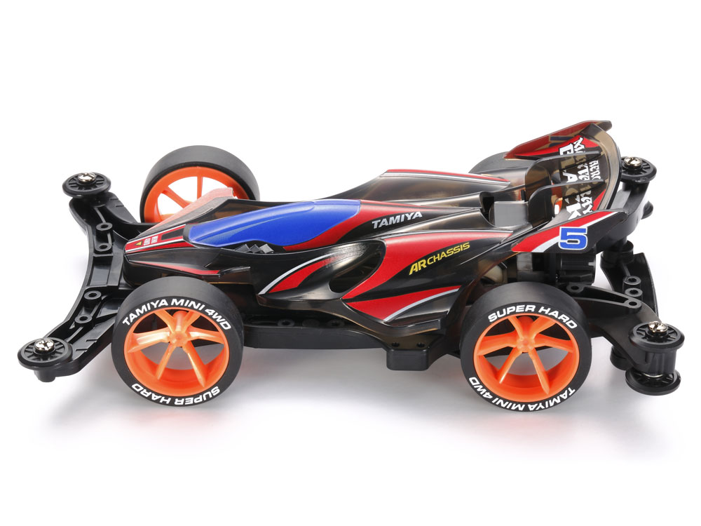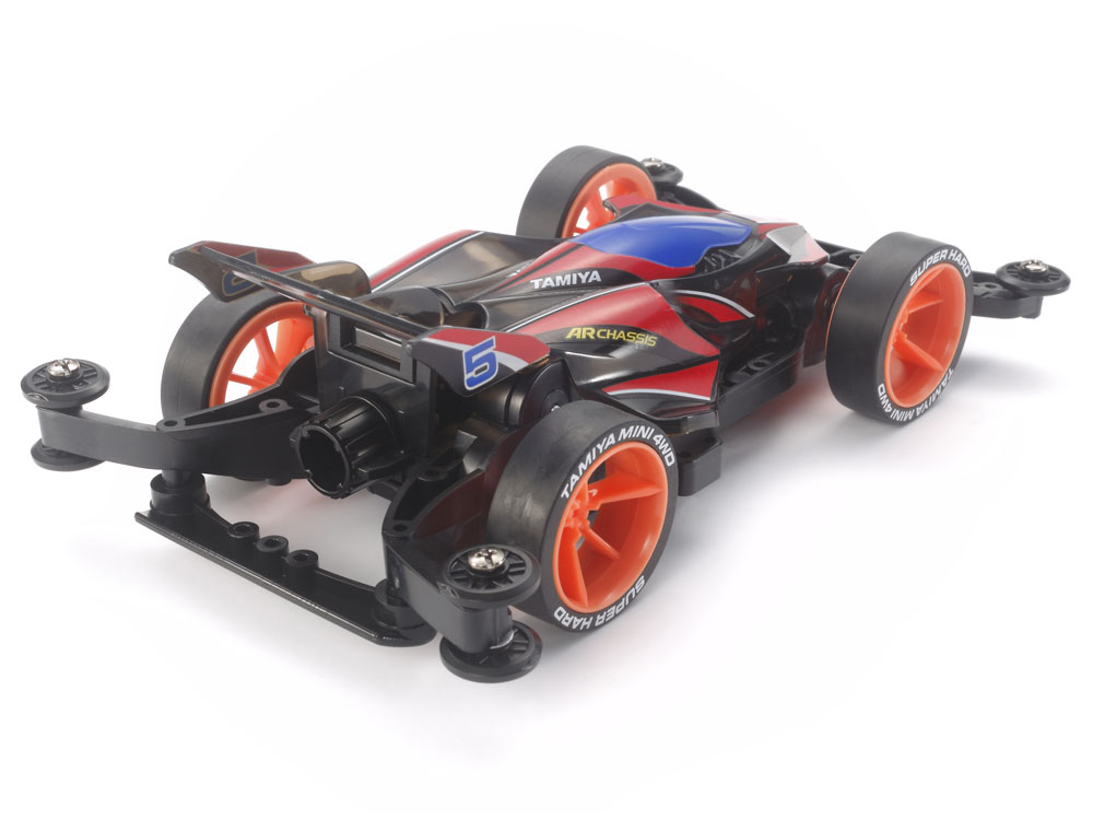 【 ARシャーシ 】 空力の追求はもちろん、整備性や剛性、拡張性などミニ四駆レースに必要な要素をかねそなえているのがARシャーシ。シャーシ下面の空気をスムーズに流すアンダーパネルとディフューザーはワンタッチで取り外しOK。アンダーパネルを外せばボディを取り外すことなくスピーディーな電池交換ができ、ディフューザーを外せばモーターやギヤのチェックが可能。また、アンダーパネルを前にずらせばモーターが取り外せます。さらに、低摩擦樹脂製のプラベアリングを装備して、駆動ロスを少なくするとともに軽量化を実現しているのもポイントです。加えて、リヤスキッドバーを標準装備。スロープセクションなどの坂道コースを通過する時に、低摩擦樹脂製のスキッドバーがコース路面と接触。マシンの姿勢を制御してコースアウトを防止します。4.2:1のスピードギヤつき。