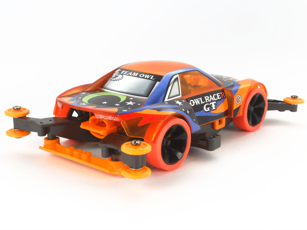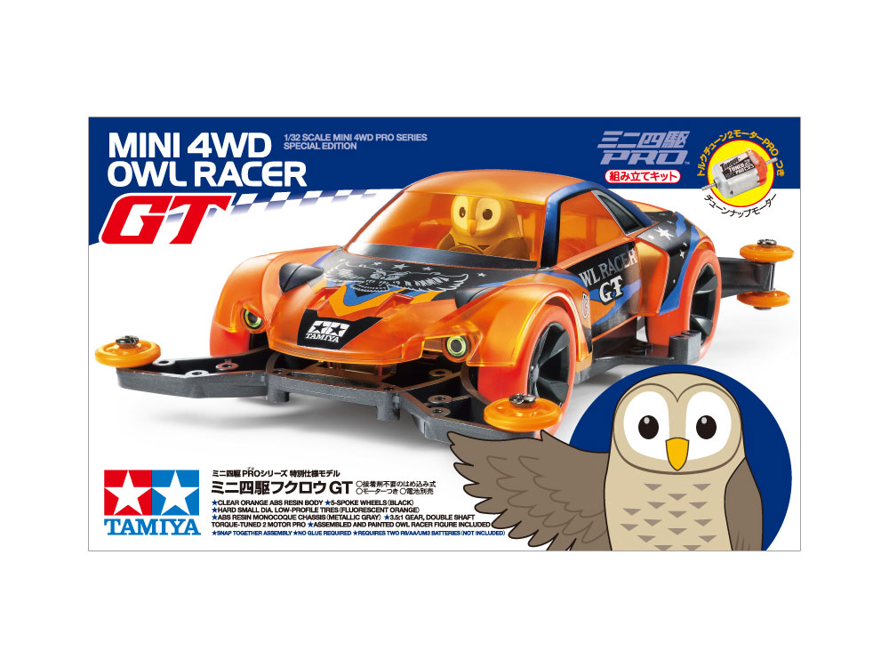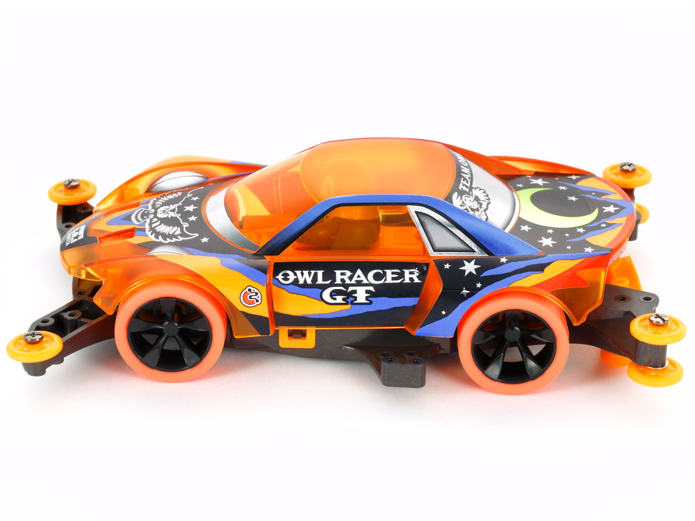 【 夜空をイメージしたマシンをフクロウがドライブ! 】 高性能な走りでレースも楽しい四輪駆動レーサーのプラスチックモデル組み立てキットです。フクロウGTはクリヤーオレンジのボディに塗装済みのフクロウが乗ったマシン。つぶらな瞳のフクロウは、かわいらしさとミステリアスな魅力たっぷりです。ボディはワイドに張り出した前後のフェンダーやクローズドボディが実車感覚を高めるアストラルスター。星がまたたく真夜中をイメージしたメタリック調のステッカーもセットしました。また、シャーシはMAを採用。本体はメタリックグレイのABS樹脂製で、ローラーやギヤカバー、リヤスキッドバーなどのAパーツはオレンジの低摩擦樹脂製です。そして、ブラックの5本スポークホイールには、蛍光オレンジのハード小径ローハイトタイヤを装着。トルクチューン2モーターPROを搭載して走行性能も十分です。 【 駆動効率を追求したMAシャーシ 】 “MA”とは、Midship AERO(ミドシップエアロ)の略。ダブルシャフトモーターを車体中央に搭載した、ミドシップレイアウトの「MSシャーシ」、走行中の気流(エアロ)を特に意識してデザインされた「ARシャーシ」。それぞれの優れた特徴を1台のシャーシにまとめあげたのが「MAシャーシ」です。もちろん、これまでに蓄積されたレーシングノウハウをいかして、3.5:1の超速ギヤをはじめ、6個の低摩擦樹脂ローラーやリヤスキッドバーも標準装備するなど、走行性能も徹底的に磨き上げました。加えて、一体型のモノコック構造の採用で、組み立てやすさやメンテナンス性もさらに向上するなど、初心者からベテランレーサーまで、また、小さめのコースで行われる街かどレースから、大型の特設5レーンサーキットの公認競技会まで、幅広く対応できるシャーシです。