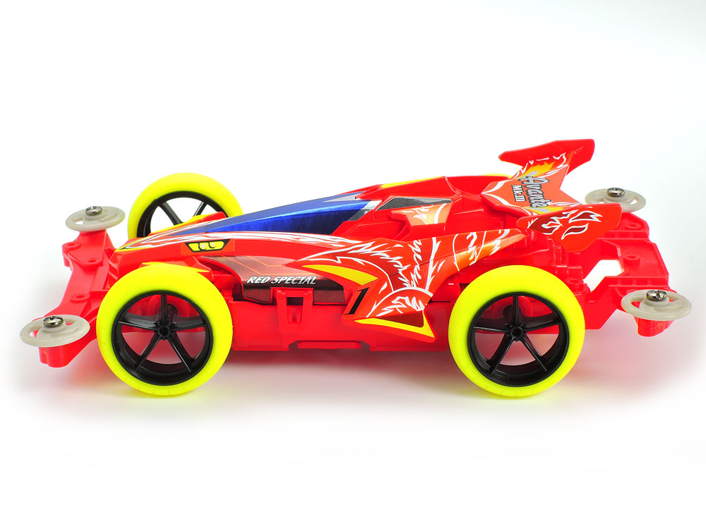 【 情熱の赤は不死鳥のイメージ 】 高性能な走りでレースも楽しい四輪駆動レーサーのプラスチックモデル組み立てキットです。モーター両端のシャフトを伸ばしたダブルシャフトモーターを車体中央に搭載して高い駆動効率を実現。MSシャーシはノーズ、センター、テールの3パートで構成され、ワンタッチで脱着OK。スピーディーで幅広いセッティング変更が楽しめます。アバンテMk.III レッドスペシャルはボディとシャーシを鮮やかなレッドで仕上げたスペシャル仕様です。ポリカABS樹脂を使用した強化タイプのシャーシはN-02、軽量センターシャーシ、T-01の組み合わせ。ブラックカラーの大径ナローライトウェイトホイールに蛍光イエローのハードバレルタイヤを装着。レッドボディに映える不死鳥をイメージした専用のマーキングをセットしました。 【 MSシャーシ 】 優れた剛性を実現する3分割式「MSシャーシ」はモーターやバッテリーといった重いパーツをシャーシ中央に配置した「ミドシップ(MS)レイアウト」とミニ四駆伝統の4WD(四輪駆動)機構で、高速走行時にも優れた安定性を発揮します。