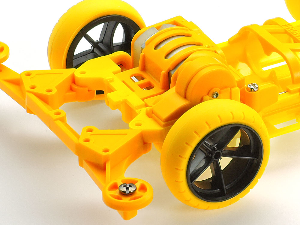 【 スーパーIIシャーシ 】 シャーシはレースでも使われて人気の高いスーパーIIを採用。本体はイエローのABS樹脂製。また、13mmプラローラーなどのAパーツはキャメルイエローのABS樹脂製です。さらに、ターン式スイッチ、2点固定式リヤステーなど走りのための装備も充実。バンパーやリヤステーはパーツ取り付け穴を複数用意して幅広いセッティングに対応しています。ギヤ比は4.2:1をセット。ブラックの大径ナローライトウェイトホイールには、イエローの大径ナローバレルタイヤを装着しました。