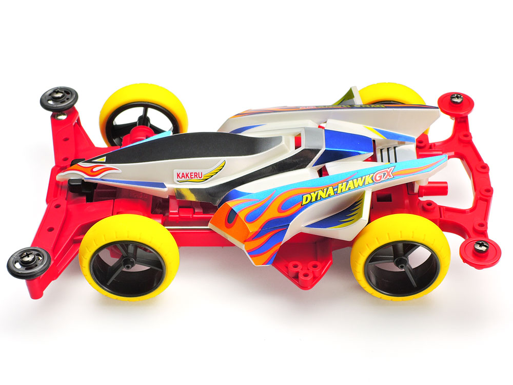 【 シャープなボディで勝利をつかめ 】 シャフトドライブ4WDを採用した高性能レーサーのプラスチックモデル組み立てキットです。ダイナホークGX スーパーXXスペシャルは、ミニ四駆マンガ「新世紀レーサー ミニ四キッズ」や「ミニ四駆新世紀 BREAK IN」で活躍したダイナホークGXのスペシャルバージョン。シャープなコクピットや、ボディ両サイドが力強く盛り上がってリヤまで伸びるスタイルは、獲物を狙って急降下するタカをイメージしています。また、シャーシにはスーパーXXを採用して、ダイナミックな走行に対応。パールホワイトのボディカラーに映えるファイヤーパターンのグラフィック、ロゴなどはメタリック調の専用ステッカーで表現しました。