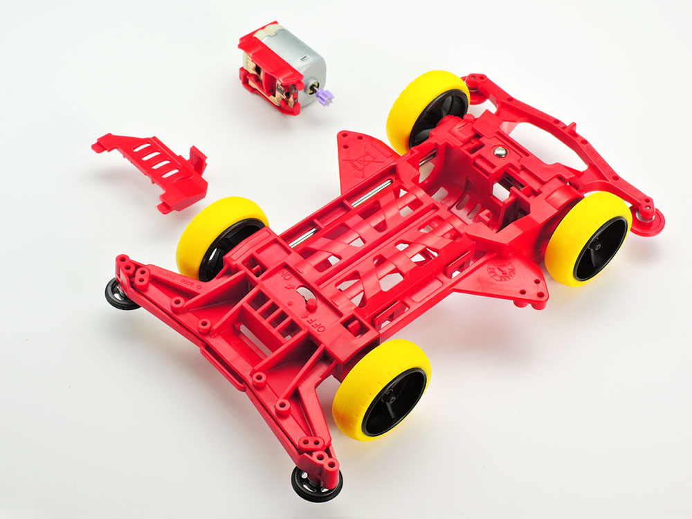 【 強度と拡張性が魅力のスーパーXXシャーシ 】 シャーシはスーパーXの強化・拡張型、スーパーXXを採用。シャーシ全体の剛性をさらにアップして、ねじれに強くなっています。また、ノーズガードや大型のサイドガードには取り付け穴を多く用意して、ワイドなローラーセッティングが可能。アップダウンやカーブが激しいコースでの活躍が楽しみです。シャーシ本体、ノーズガード、リヤローラーステーはポリカABS樹脂製の強化タイプ。カラーリングは情熱的なレッドとしました。また、ブラックの大径ナローライトウェイトホイールは、カーボンファイバー配合のナイロン樹脂製。イエローのバレルタイヤとの組み合わせはインパクト十分です。14mmゴムリングローラーも2個装備。ギヤ比は4:1の高速タイプをセットしました。