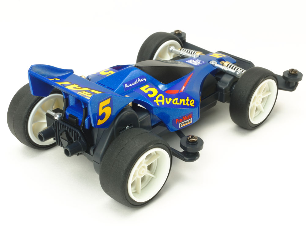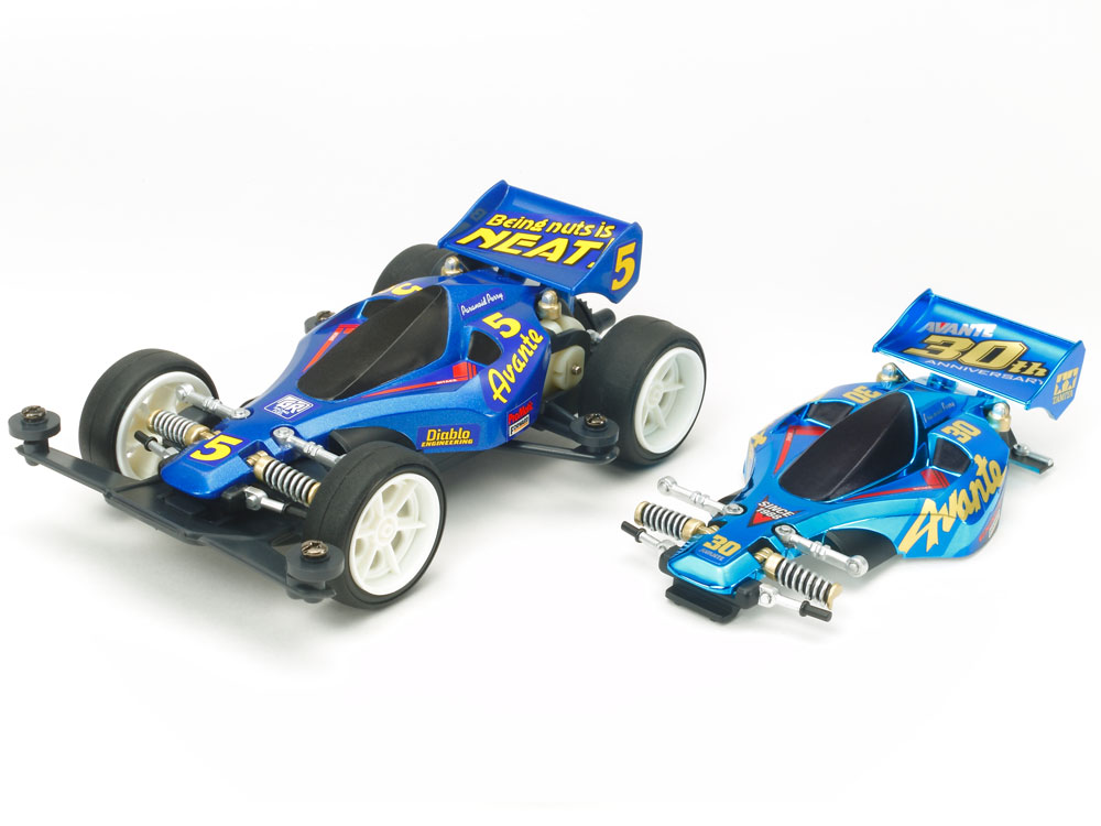 【 メッキボディと特製ステッカーをセットしてアバンテJr.が復活 】 高性能な走りでレースも楽しい四輪駆動レーサーのプラスチックモデル組み立てキットです。アバンテJr.30周年スペシャルキットは、1988年12月に発売され、数あるミニ四駆の中で人気・知名度ともにNo.1のアバンテJr.の復刻版。しかも、ボディはオリジナルのブルー仕様とスペシャル感のあるブルーメッキ仕様の2タイプを用意し、ステッカーもオリジナルデザインに加えて、30周年記念デザインの特別仕様をセットしました。また、パッケージは基本的に初版発売当時の仕様を引き継ぐメモリアル感の高い仕上がりです。シャーシは初版当時のタイプ2を採用。本体はグレイカラーのABS樹脂製で、ホワイトカラーの6本スポークホイールに、大径スリックタイヤを装着しました。