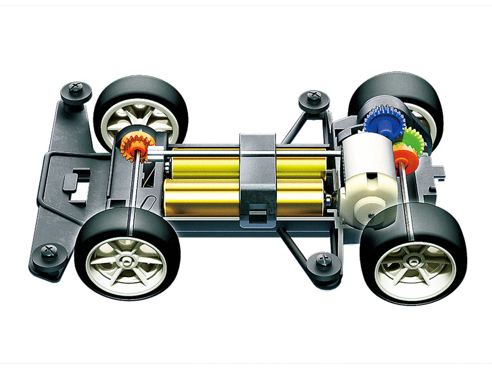 【 シャーシはオンロード性能を磨いた当時のままのタイプ2を採用 】 タイプ2シャーシはオンロード競技用として開発された初めてのシャーシです。重心の低さと、本体に施された軽量化のための穴あけ加工が特徴。直進時の安定性に優れる長いホイールベースは、ストレートの多いコースレイアウトで威力を発揮します。また、ガイドローラーを標準装備し、高効率のギヤを採用。5:1と4.2:1の2種類のギヤ比が選択できるのもポイントです。さらにスイッチはオン-オフを切り替えやすく、ターミナルの形状も工夫されています。ミニ四駆の人気を決定づけた記念すべきシャーシの1つです。