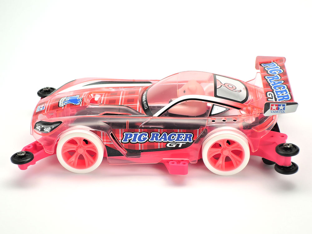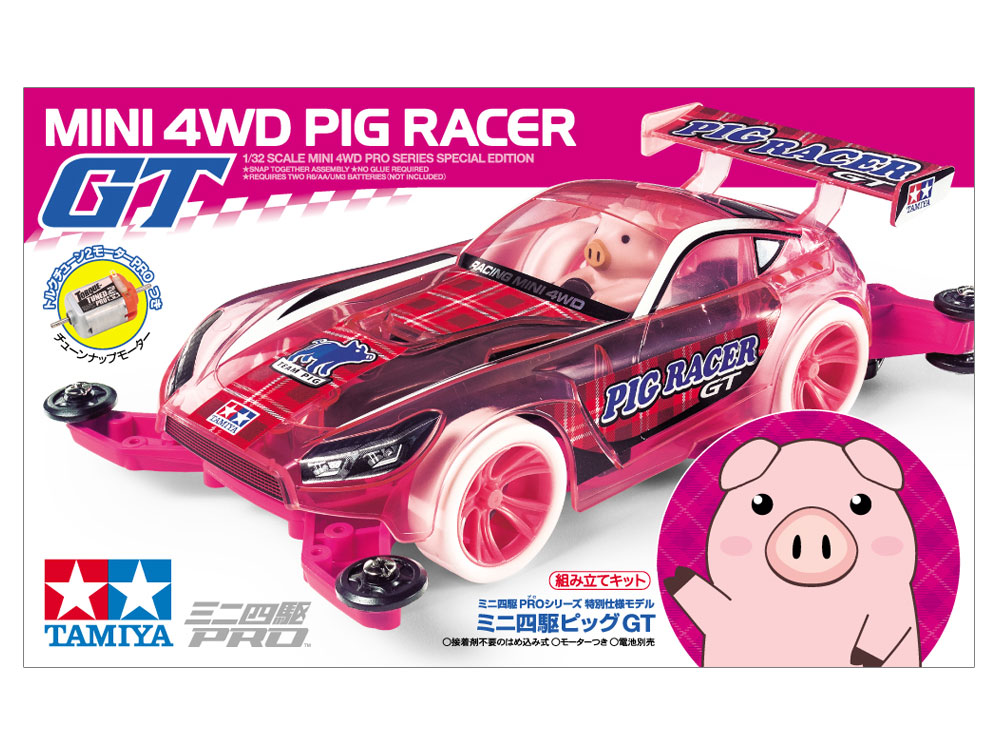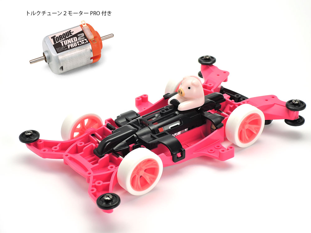 【 GTマシンを操る丸くてかわいいブタドライバー 】 高性能な走りでレースも楽しい四輪駆動レーサーのプラスチックモデル組み立てキットです。ピッグGTは、クリヤーピンクのボディに塗装済みのブタドライバーが乗ったマシン。ボディはヨーロッパのGTカーをイメージしたジルボルフを採用して、ぽっちゃり気味のブタドライバーとの組み合わせがコミカルです。また、ABS樹脂製のシャーシ本体はマゼンタ(ピンク)、バッテリーホルダーやギヤカバーなどのAパーツはブラック、Aスポークホイールは蛍光ピンクで仕上げ、ホワイトのハード小径ローハイトタイヤを装着。メタリック調の専用ステッカーも用意しました。さらに、加速力に優れるトルクチューン2モーターPROを標準装備。かわいらしさはもちろん、走りも注目のマシンです。