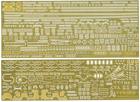 艦体は左右分割方式で舷側には舷窓、モンキーラッタル、舷外電路などの細部をモールドで再現。 51センチ連装砲3基、長10センチ連装高角砲12基と対空火力の大幅な増強が図られ、 大和型を上回る戦闘能力をもった戦艦となる予定だった姿を専用部品で再現。 艦橋はスライド金型を採用し、4面それぞれに情報量の多い彫刻を施しております。 インジェクションパーツでは再現の難しい、細部に至るまで表現できるエッチングパーツを収録。 エッチングパーツは手摺、 防水扉、ラッタル、梯子などを収録しています。