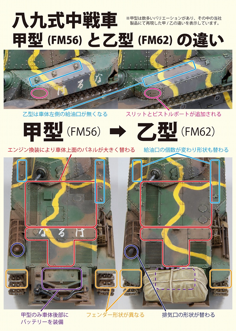 日本における最初の制式戦車である八九式戦車は、開発当初にはガソリンエンジンを搭載していましたが、水の確保が難しい大陸での運用を想定し冷却水が不要かつ燃費の向上、さらに燃料漏れなどによる車体炎上の危険性を減らすことも出来る『空冷ディーゼルエンジン』に換装されます。このエンジンが換装されたタイプが乙型と呼ばれ、それまでのガソリンエンジン搭載車両は甲型と呼ばれ区別されました。当キットでは乙型の特徴でもある車体上面の給油口など違いを細かく再現しています。さらに当時の写真でよく見られる、車体後部の尾体に乗せられたシートにくるまれた荷物をプラスチック製パーツにてモデル化。