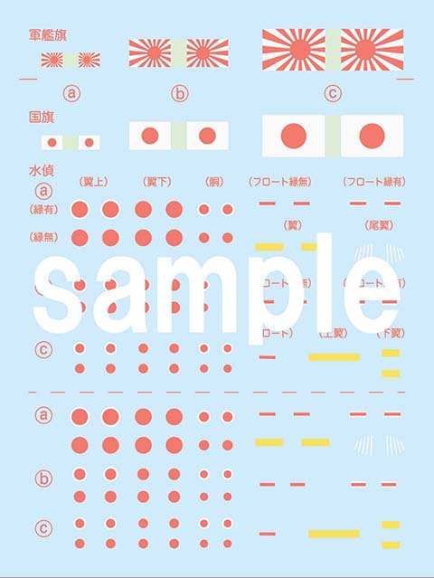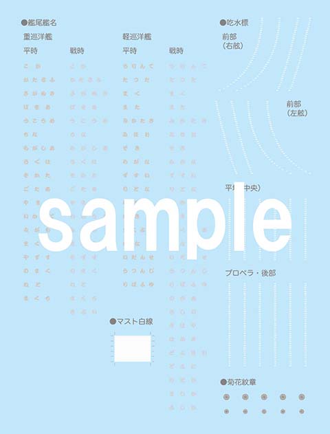 ●付属デカールは2種類 ・付属デカールは2種で軍艦旗や日章旗、艦載機のマーキングを収録したデカール。 ・軍艦旗等はサイズ3種を用意。実物の10巾、6巾、3巾の寸法を1/700スケールとしたものが収録。 ・艦載機の日の丸、味方識別帯(黄帯)など収録し、日の丸は大戦後期の白縁がないものも含みます。 ・喫水表記や艦首の菊花紋章、艦尾の艦名表記(金色および軍艦色塗りつぶしの2種)を収録したデカール。