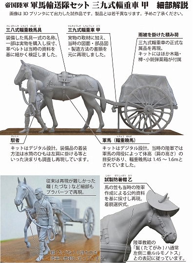 日本陸軍の主力輸送兵器のひとつとして、明治時代に制式制定されてから終戦まで活躍したのが三九式輜重車(さんきゅうしき しちょうしゃ)です。三九式輜重車は馬一頭でひく荷馬車で、弾薬・糧食・軍需品といった様々な物資の輸送に活躍しました。運用は輸送専門の部隊だけでなく、歩兵・砲兵・工兵といった各種部隊にも広く配備されており、模型においては多様なシチュエーションのジオラマにも対応する事ができます。 輜重車をひく軍馬が身に着ける三八式輜重輓馬具(さんぱちしき しちょうばんばぐ)も考証を重ね精密に再現。軍馬本体は手綱をひく御者とともに3Dモデリング(コンピュータ上の3次元グラフィックスで立体物データを形成)にて味わい深く立体化。組み立て辛くなりがちな手綱なども含め、3D設計ならではの組み立てやすさを追及していますあわせて日本陸軍の決まりに則った積み荷も付属します。 初のプラモデル化。2024年完全新金型。