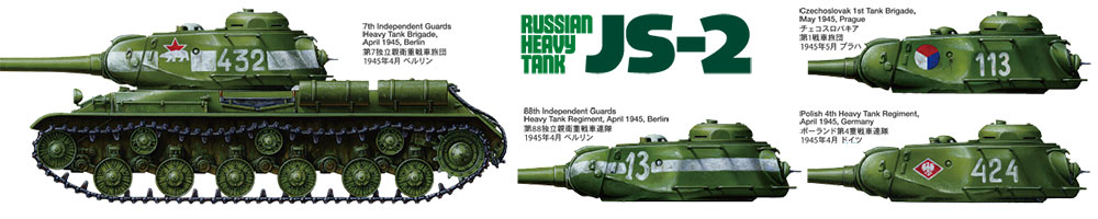【 ドイツ軍を圧倒した迫力のソビエト重戦車 】 ドイツのタイガーI を正面から撃破するために開発されたのがソビエト重戦車JS-2です。強力な長砲身122mm砲と最大120mmに達する重装甲、優れた機動力を兼ね備え、第二次大戦後半の1943年12月に生産を開始。1944年8月からは車体前面上部のハッチや段差をなくし、防御力を高めるなど大幅な改良が施されました。中でもチェリャビンスク・キーロフ工場(ChKZ)で生産された車輌は、丸みのある一体鋳造製の車体前部が特徴です。JS-2は対戦車戦はもちろん防御陣地の突破戦にも絶大な威力を発揮。大戦末期のソビエト主力戦車として勝利に貢献したのです。