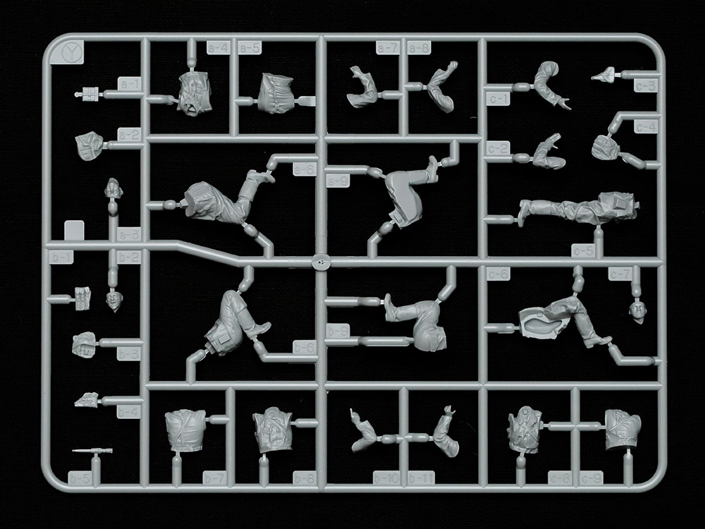 ★三脚銃架に載せたMG34機関銃を射撃する重機関銃チーム2名、レンガ塀の陰からMG42機関銃を射撃する兵士、弾薬箱を運ぶ兵士、そして短機関銃を射撃する指揮官の計5体をモデル化。