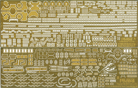 接着が不要:パーツ同士をはめ込む設計仕様により簡単に組立てられるようになっています。 木甲板部は従来の木材色に代えて濃灰色の専用色で成型された専用パーツを封入。 スクリュープロペラは従来のベージュ色よりリアルなゴールドの成型パーツを封入。 エッチングパーツには、手摺、ラッタル、梯子、クレーン、煙突周り、13号電探、21号電探、方位測定器、防水扉、菊花紋章などを収録。