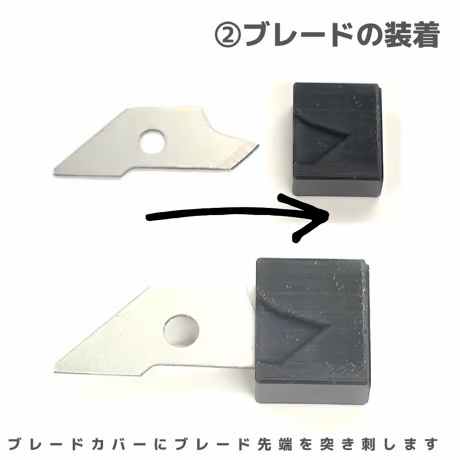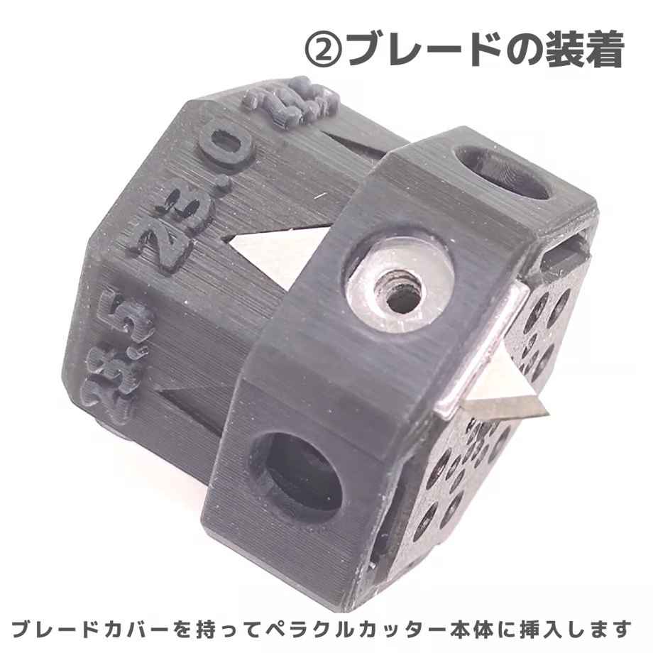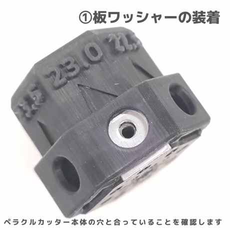1.ペラクルカッター本体の面に板ワッシャとブレードを差し込み、付属の専用ネジでしっかり締めます。