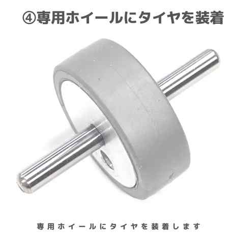 2.カットしたいタイヤを金属のホイールに取り付けし、タイヤホルダーに差し込みます。