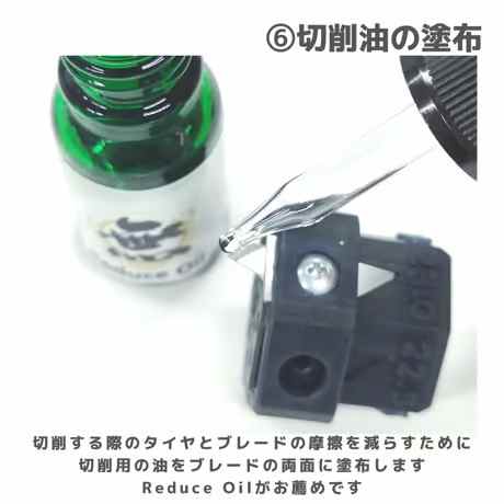 3.ブレードにオイルを塗布し、少しずつタイヤに軽く押し付けながら何回も回転させて切ります。