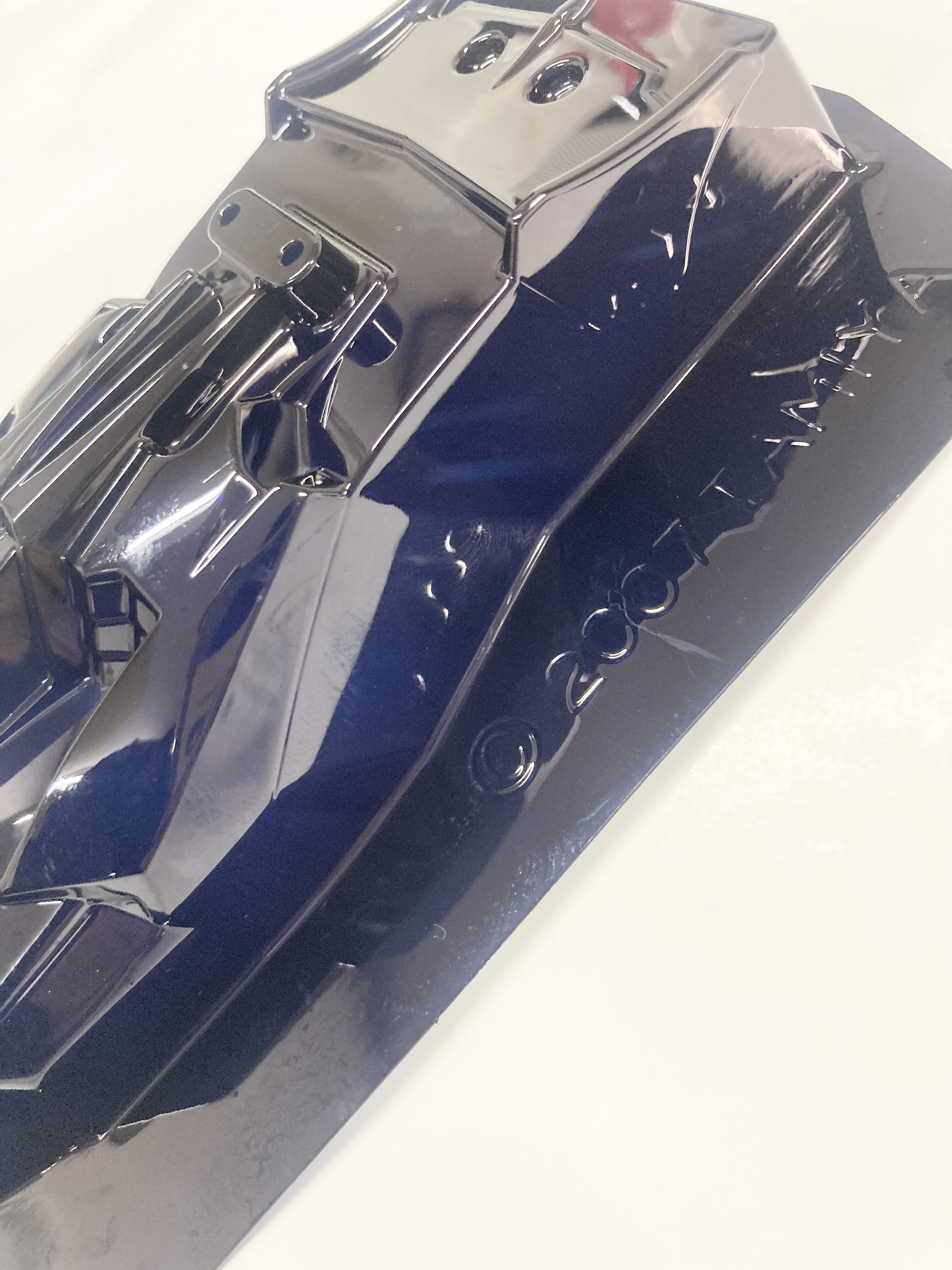 キット標準のボディに比べて約半分の軽さ、しかも強度も十分なポリカーボネート製クリヤーボディです。マシン上部の軽量化となるだけに大きな効果を発揮。低重心化にもなります。専用設計のボディマウントパーツとマーキング用ステッカー付。