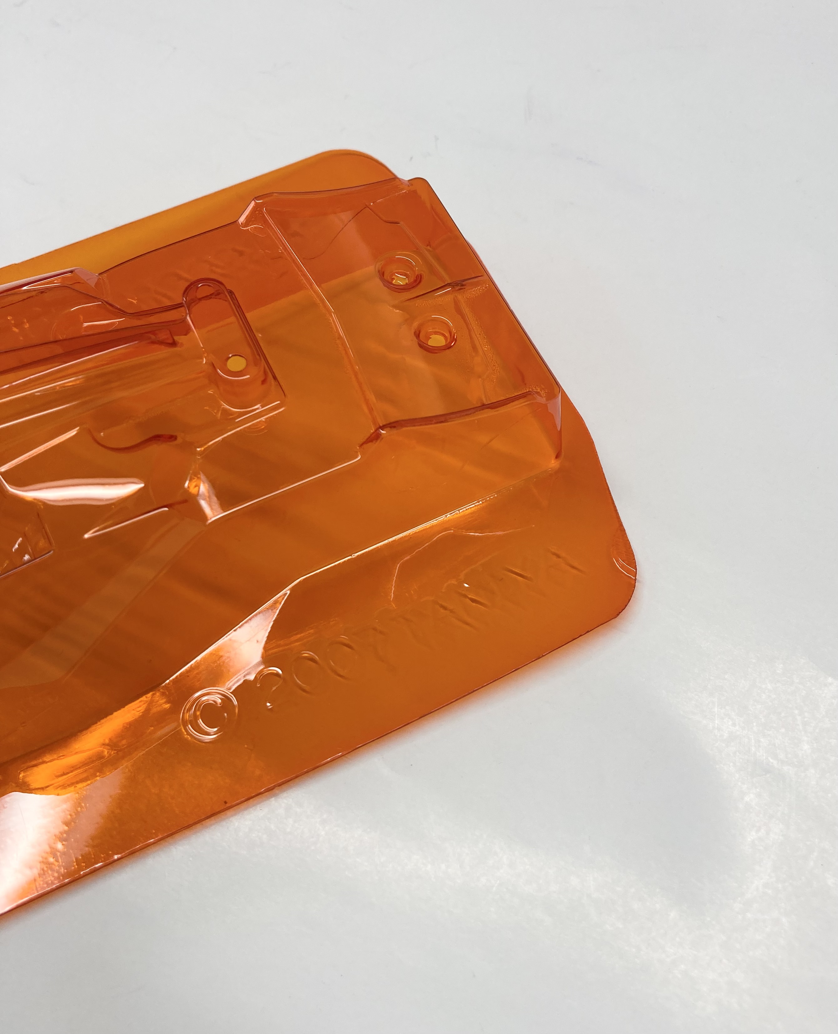 キット標準のボディに比べて約半分の軽さ、しかも強度も十分なポリカーボネート製クリヤーボディです。マシン上部の軽量化となるだけに大きな効果を発揮。低重心化にもなります。専用設計のボディマウントパーツとマーキング用ステッカー付。