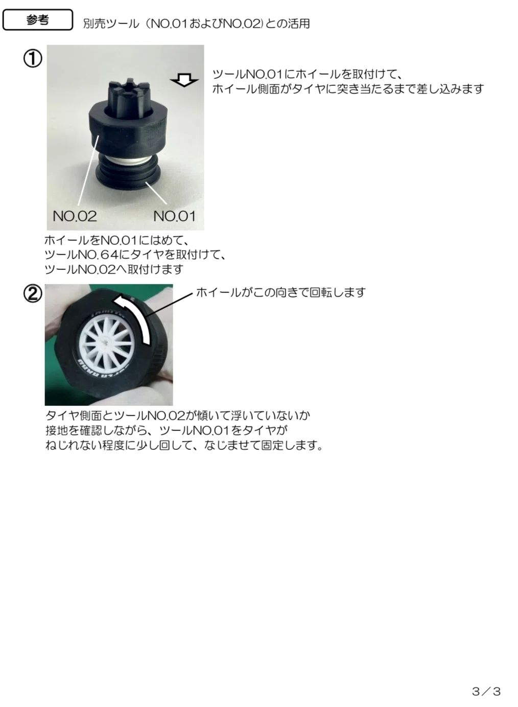 《タイヤホイール製作 便利ツール》 ⚫ホイール貫通 ⚫タイヤ挿入(接着) 2つの作業を本ツールで行えます 【従来のNO.04,05ツールから、対応するホイールを増やし、小径タイヤを中径ホイールに取り付けることが出来ますので、より幅広いセッティングが可能になります。】 ◎追加機能 ・Yスポークおよび12スポークホイール対応 ツール取扱い説明書にホイール対応表を掲載して おりますのでご確認ください。 ※PP、カーボン材質ともに使用できます。 ・小径タイヤを拡張し、ホイールは挿入できます。 ・別出品のツール《NO.01およびNO.02》に対応し、より作業が楽になります 【商品紹介】 <ホイール貫通&タイヤ接着ツール> ・加工作業を補助しお手持ちの治具を 打ち込み、および抜き取り時に損傷させ にくい作りにしています <内容物> ・ホイール貫通&タイヤ接着ツール 製品番号:NO.64,65 各 1個 ※中径ローハイトホイール用 <用途> ・ツール NO.64 ホイール貫通ガイド&タイヤ挿入時の拡張用と して使用します。 貫通時、【P!MODEL LABO】メーカー様 製品のシャフトブレード(P11、P23、P31、 P32)全てに対応しています ・ツール NO.65 ホイール貫通の打ち込み土台&タイヤ挿入時の タイヤ保持台として使用します。 ツールの裏表面を使い分けて、2つの作業が可能です。