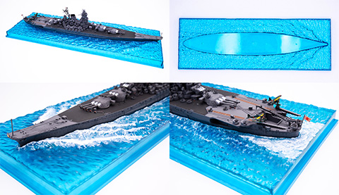 ・展示用海面ベースは艦首や舷側、推進器から発生する航跡波を立体的に表現。